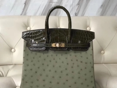 Hermès(爱马仕)Birkin25cm ostrich kk鸵鸟皮 v6丛林绿拼亮面橄榄绿鳄鱼内拼 I9杏黄色 蜡线全手工 金扣