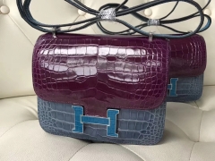 Hermès(爱马仕)Constance18cm Crocodile shiny 亮面鳄鱼 三拼 加伦紫拼牛仔蓝拼伊兹密尔蓝 鳄鱼扣
