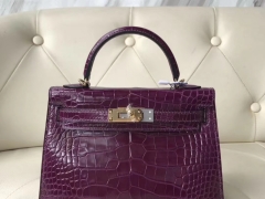 Hermès(爱马仕)Kelly 2代 19cm shiny alligator crocodile 亮面框框鳄鱼 N5加仑紫 顶级工艺 蜡线全手工 金扣