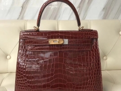 Hermès(爱马仕)Kelly cut 31cm porosus shiny 亮面鳄鱼 波尔多酒红 金扣