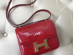 Hermès(爱马仕)Constance 19cm shiny alligator crocodile ck95法拉利红 蜡线全手工