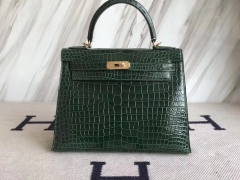 Hermès(爱马仕)Kelly28cm shiny porosus crocodile 澳洲湾鳄 ck67祖母绿 顶级工艺 全手工蜜蜡线缝 金扣