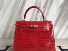 Hermès(爱马仕)Kelly25cm Crocodile shiny 亮面两点鳄鱼 ck95 法拉利红 Braise 金扣