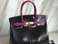 Hermès(爱马仕)Birkin30cm Porosus shiny 亮面澳洲湾鳄 ck89 黑色拼天方夜谭粉紫 拉丝金扣 马蹄印