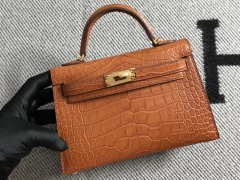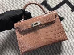 Hermès(爱马仕)Minikelly ll Alligator shiny 亮面鳄鱼 6Q 褐色 银扣