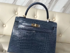 Hermès(爱马仕)Kelly25cm Alligator shiny 亮面鳄鱼 7N 风暴蓝 金扣