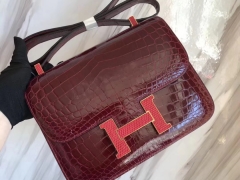 Hermès(爱马仕)Constance24cm Crocodile shiny 亮面鳄鱼 F5 新酒红 勃艮第酒红 蜥蜴扣 金扣