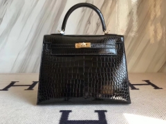 Hermès(爱马仕)Kelly25cm Porosus shiny 亮面澳洲湾鳄 ck89 黑色 金扣