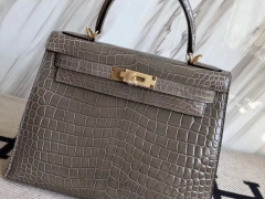 Hermès(爱马仕)Kelly28cm Porosus shiny 亮面澳洲湾鳄鳄鱼 ck81 斑鸠灰 Gris T 金扣