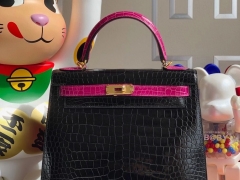 Hermès(爱马仕)Kelly 28cm porosus shiny 亮面澳洲湾鳄 ck89 黑色 拼 天方夜谭粉紫 金扣 马蹄印 现货