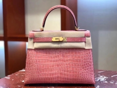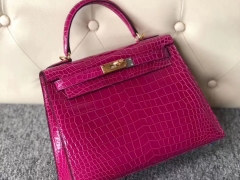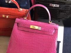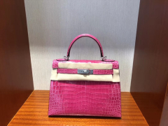 Hermès(爱马仕)Kelly 凯莉包 Crocodile shiny 亮面鳄鱼 5J 桃红 桃粉 银扣 顶级手缝 超美 28cm
