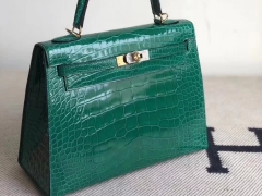Hermès(爱马仕)Kelly 凯莉包 Alligator shiny 亮面鳄鱼 6Q翡翠绿 金扣 顶级手缝 25cm 现货
