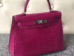Hermès(爱马仕)Kelly 凯莉包 Porosus shiny 亮面澳洲湾鳄J5 天方夜谭粉紫 银扣 28cm