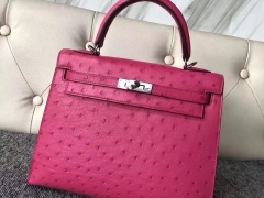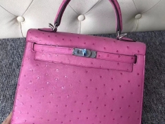 Hermès(爱马仕)Kelly 凯莉包 ostrich kk鸵鸟 顶级鸵鸟皮 桃红 蜡线全手工 银扣 25cm
