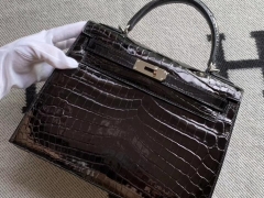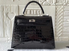 Hermès(爱马仕)Kelly 凯莉包 亮面鳄鱼皮 黑色 银扣 25cm