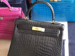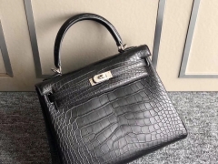 Hermès(爱马仕)Kelly 凯莉包 亮面澳洲湾鳄 黑色 银扣 28cm 现货