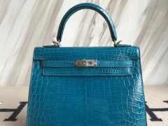 Hermès(爱马仕)Kelly 25cm Crocodile 亮面鳄鱼 7w 伊兹密尔蓝 银扣 顶级手缝 现货