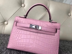 Hermès(爱马仕)Kelly 凯莉包 雾面框框美洲鳄 5P樱花粉 蜡线全手工 银扣 2代 19cm