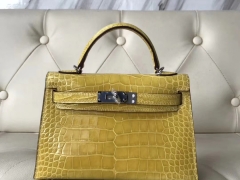 Hermès(爱马仕)Kelly2代 19cm shiny alligator crocodile 亮面框框鳄鱼 9R柠檬黄 蜡线全手工 银扣